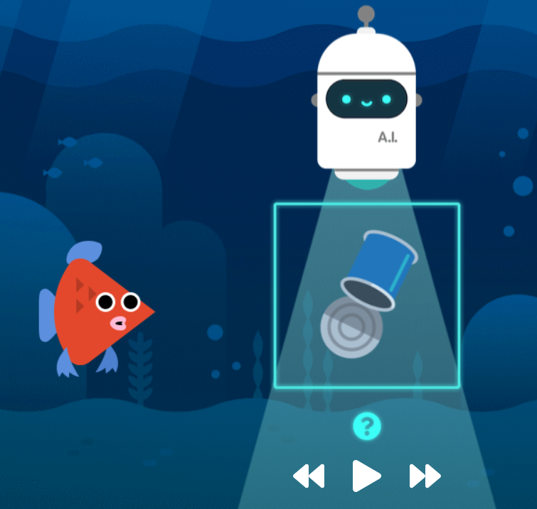 This exercise uses the ocean scanning exercise from the course AI for Oceans. Using a web browser, students have to train a robot to differentiate between fish and garbage as well as between different kinds of aquatic animals.
