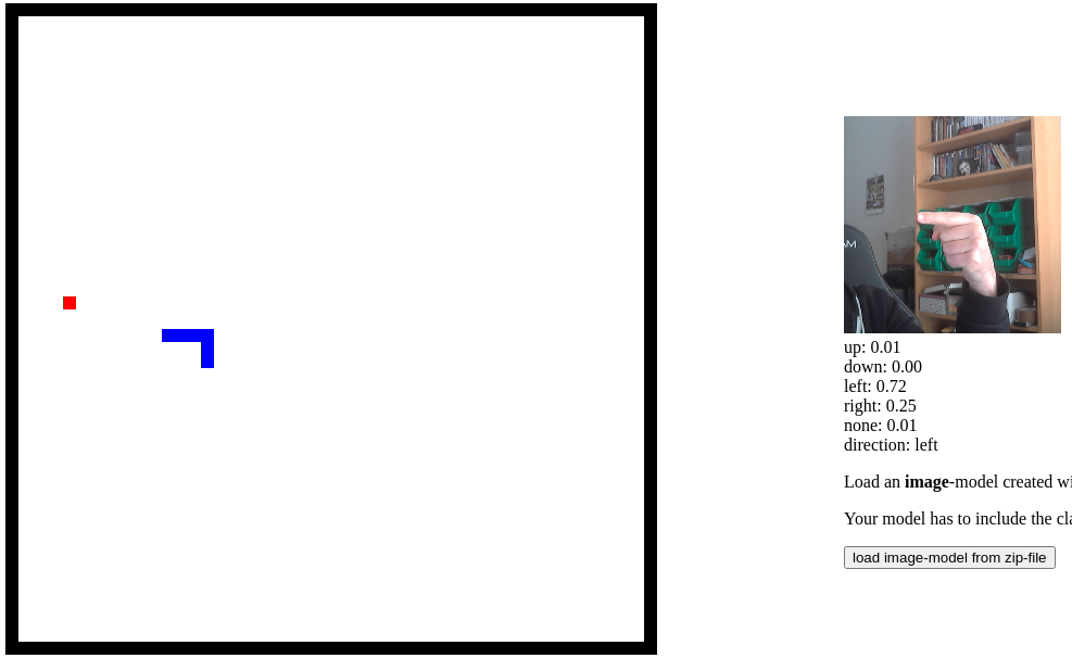 The goal of this exercise is to let the students train their own real time image classification model. During this process, many of the previously discussed problems will occur and students have to try to make their model as robust as possible. To demonstrate further the difficulties in real applications the used camera should be changing direction/position to highlight problems in their training sets (like background objects). In the end the students will have a working model that provides directions and can be used to control the game Snake (or, for very advanced students, in any other application they use TensorFlow in).