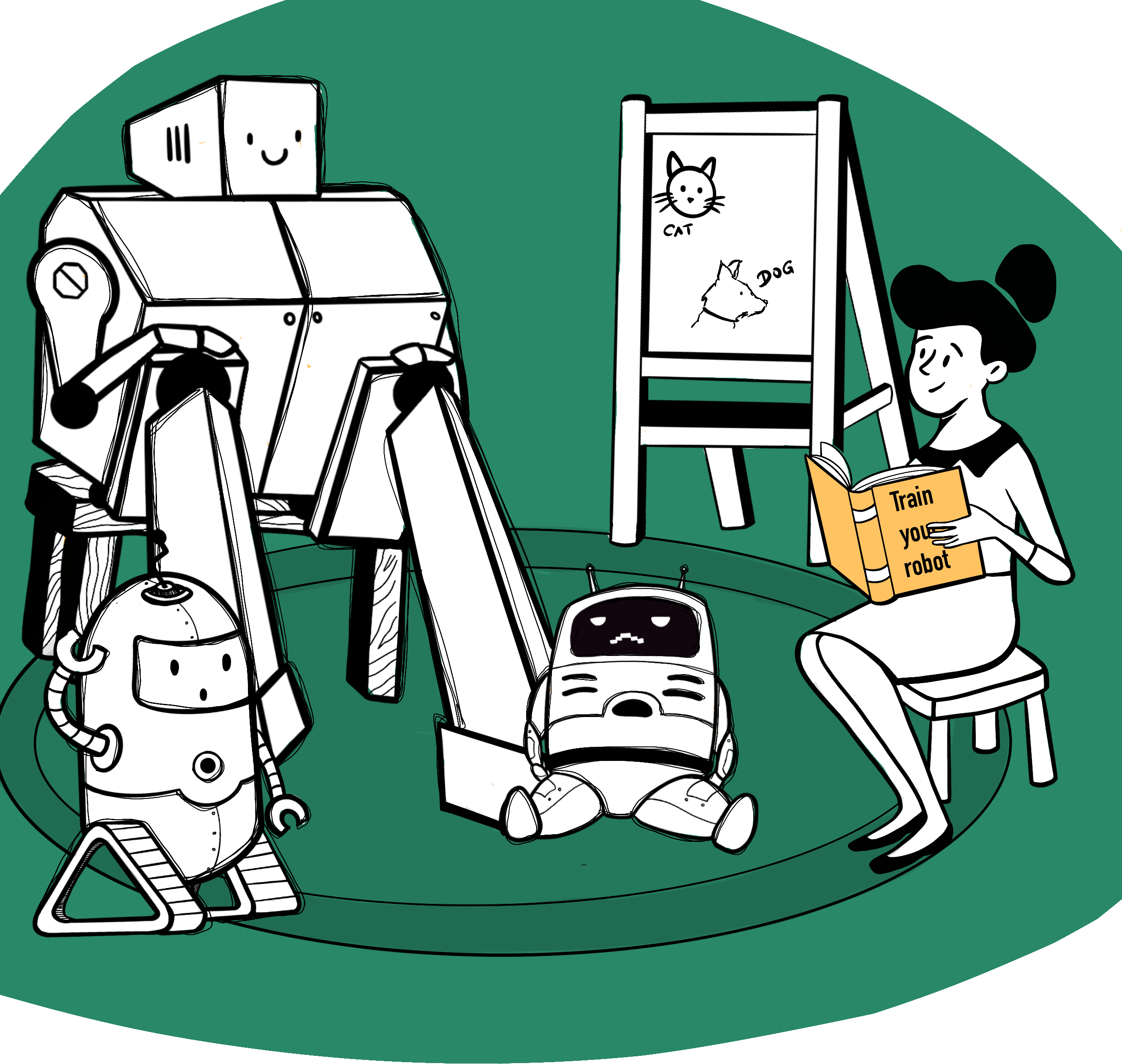 In the last section the process of training is introduced. It is based on the idea that the developer provides the algorithm with examples (e.g., this is a dog) and the Supervised Learning program adapts its internal model (e.g., variables in a formula) to produce the correct output. Additionally, the concept of trainings- and test-data is introduced.